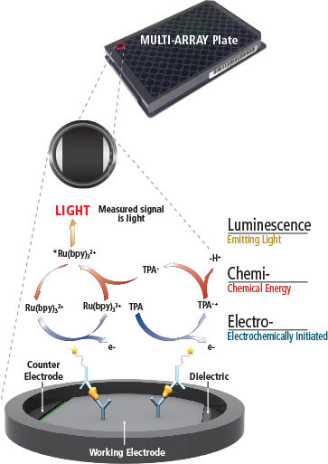 - Electricity is applied to the plate electrodes by an MSD instrument leading to light emission by SULFO-TAG labels. Light intensity is then measured to quantify analytes in the sample.