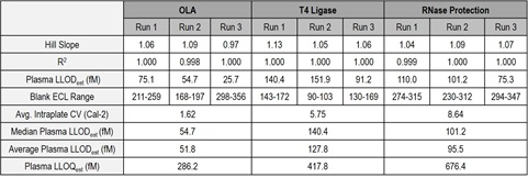 These data indicate that, paired with various techniques, the N-PLEX platform is a viable option for highly sensitive detection of ASOs in complex biological matrices. In fact, an average plasma LLODest of 51.8, 127.8, and 95.5 fM was achieved using OLA, T4 DNA ligation, and RNase protection assay, respectively. Factors to consider when designing assays for the detection of ASOs on the N-PLEX platform include the length and modifications of the specific ASO, type of biological matrix, assay time, and requirements for sensitivity and specificity.