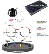 MSD’s electrochemiluminescence (ECL) detection technology uses SULFO-TAG labels that emit light upon electrochemical stimulation initiated at the electrode surfaces of MULTI-ARRAY and MULTI-SPOT microplates.