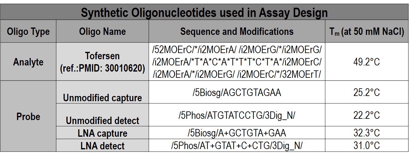 Tofersen is a highly-modified antisense oligonucleotide gapmer containing DNA bases, 2’-O-methoxyethyl-modified RNA bases and phosphorothioate (*) bonds for increased uptake and nuclease resistance (Takakusa et al. PMID: 36735616). The relatively low melting temperature of this analyte makes the development of a strictly hybridization-based, room temperature assay challenging without the use of locked nucleic acids (LNAs) in the probe design.