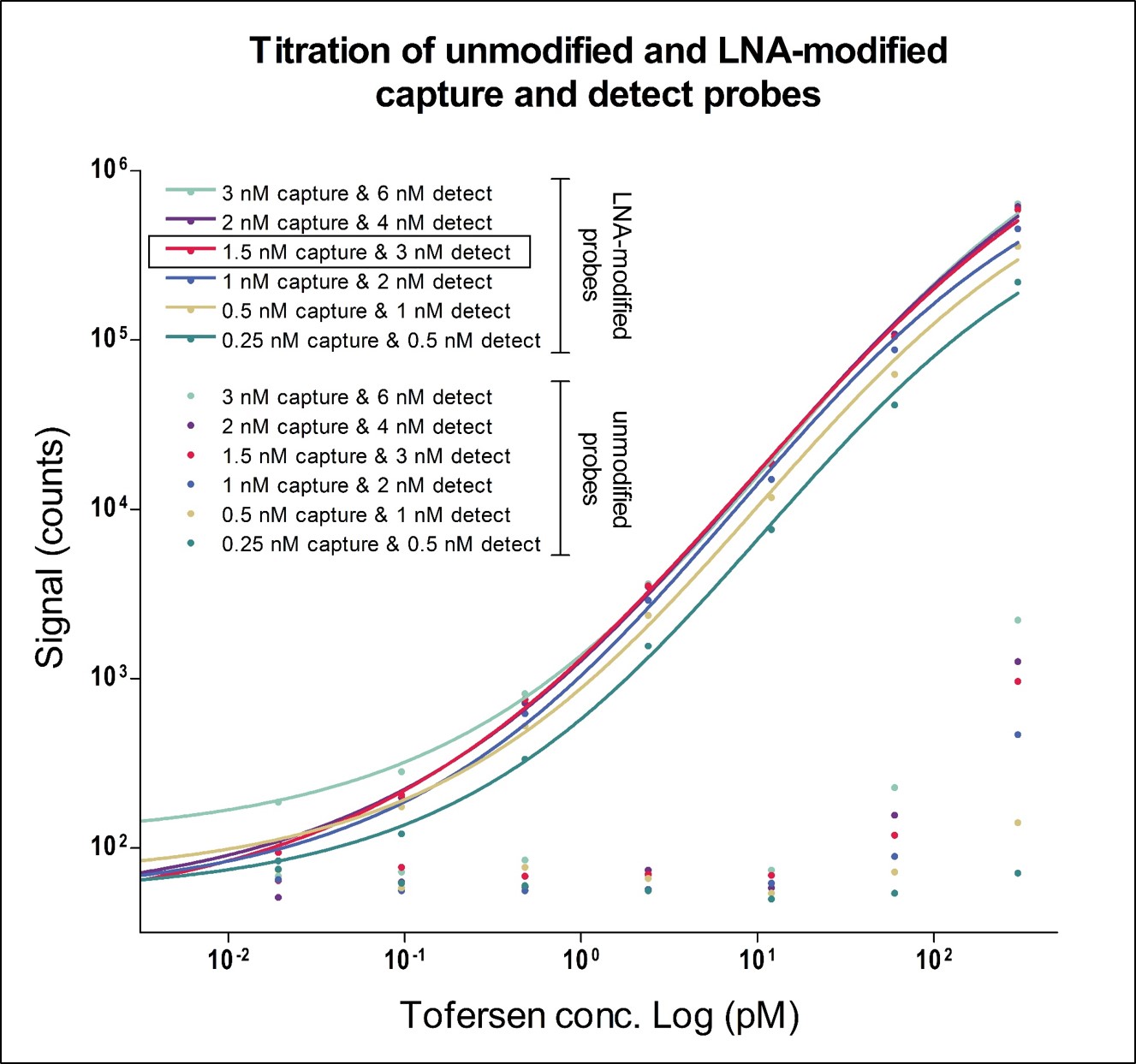 To demonstrate the beneficial effect of Synthetic Oligonucleotides used in Assay Design LNAs on assay sensitivity, we designed and evaluated a set of unmodified capture and detect probes, as well as LNA-modified versions of these probes in our hybridization assay.
