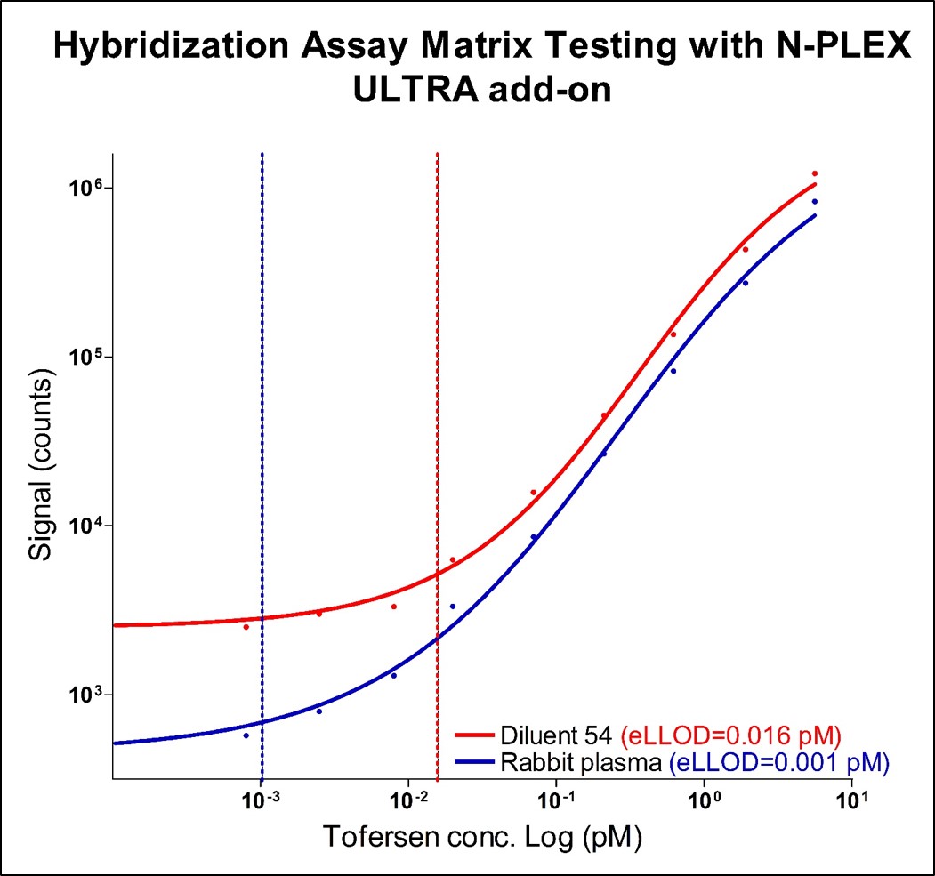 The feasibility of the proprietary N-PLEX ULTRA signal amplification method was evaluated in both diluent and rabbit plasma. This application requires two additional steps in the assay protocol that extend the assay time by 90 minutes. This assay format provides excellent results in complex matrices such as plasma. We achieved an approximately 50-fold increase in assay sensitivity in rabbit plasma compared to the non-amplified method and an eLLOD of 1 fM (7 fg/mL).