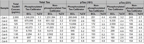 The detection limits for the pTau assays are 166 fg/ml for pTau(181) and 2,663 fg/ml for pTau(231).  The assays are likely more sensitive given that the calibrator may not be 100% phosphorylated (further characterization of the calibrator is in process).  Compared to pTau assays on the market, the S-PLEX pTau(181) assay is approximately 1000-fold more sensitive and the S-PLEX pTau(231) assay is approximately 35-fold more sensitive (after correcting for calibrator size/weight).