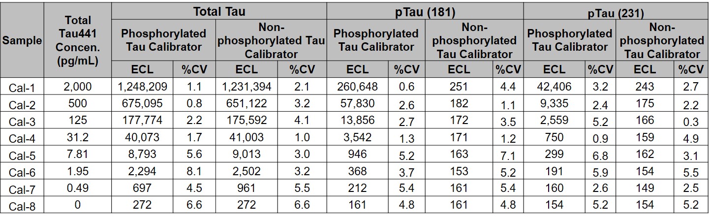 The specificity of the pTau assays was assessed by measuring their cross reactivity to non-phosphorylated and phosphorylated Tau protein.   Dilution curves of both forms of calibrator were measured on all three assays.