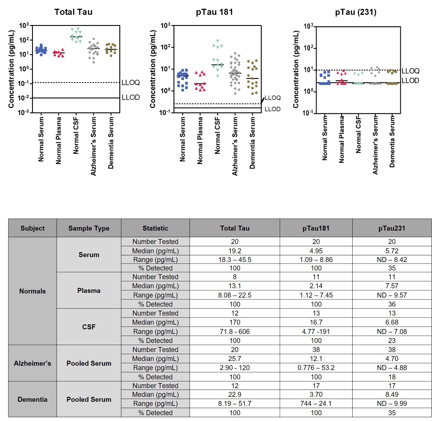 Methods: MSD’s ultrasensitive assay format, S-PLEX®, uses MSD’s MULTI-ARRAY® electrochemiluminescence technology and allows for quantitation of biomarkers at fg/mL levels, up to 1000-fold lower than with standard immunoassay formats.  Three Tau S-PLEX assays were developed: a total Tau (tTau) assay to quantitate all forms of Tau, and assays to quantitate Tau phosphorylated at two different sites (threonine 181 [pTau181] and threonine 231 [pTau231]).  The assays were qualified to measure the three markers in serum and plasma samples.